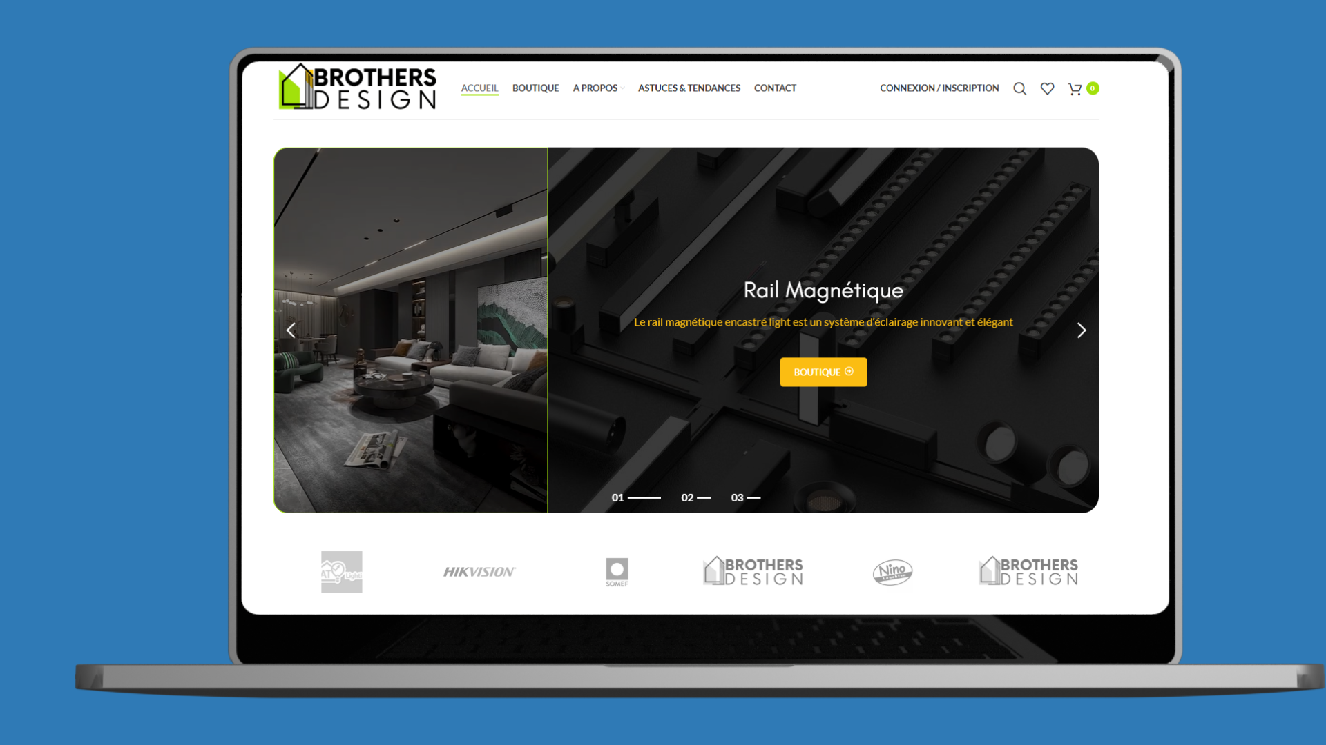 Le site de la société Brothers Design a été conçu et réalisé par notre équipe avec un double objectif : refléter l’élégance et la créativité de leur univers de l’éclairage, et offrir une expérience utilisateur fluide et moderne. En étroite coopération avec les fondateurs, nous avons travaillé l’identité visuelle, l’ergonomie, la navigation et la mise en valeur de leurs collections – de la sélection suspensions, appliques murales, plafonniers jusqu’aux solutions sur-mesure. Chaque page a été pensée pour traduire leur approche « écoute, conseil et créativité » et pour guider le visiteur depuis la définition du besoin jusqu’à l’installation finale.